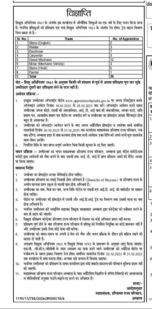 Ambala Roadways Apprentice Recruitment 2025