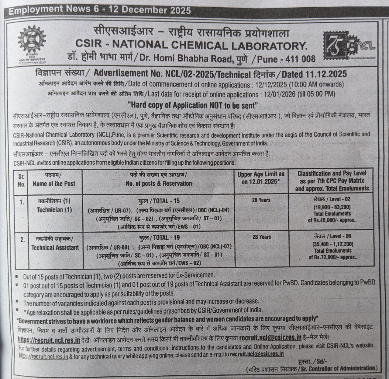 CSIR-NCL Technical Posts Recruitment 2025 - 34 Post